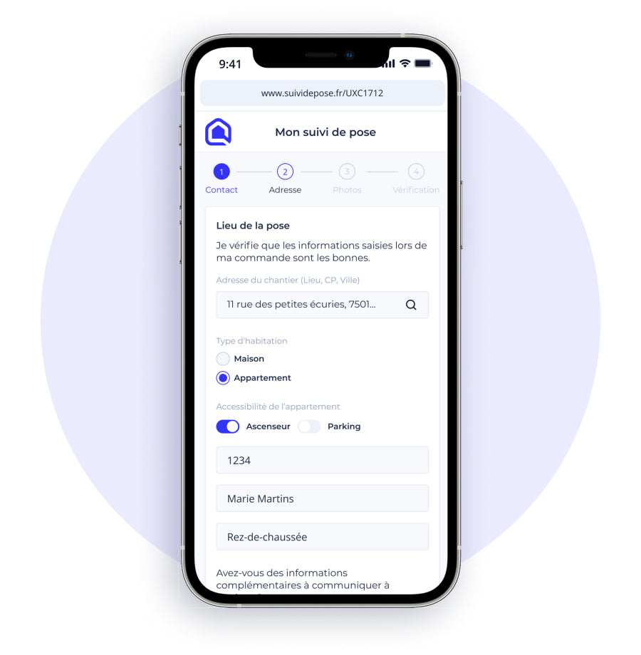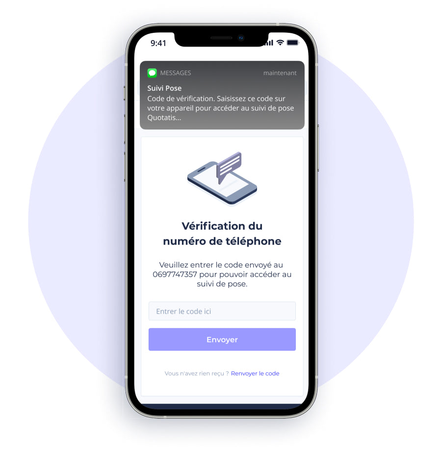 À la réception de la commande, on vous envoie un SMS avec le lien vers votre Suivi de pose. Votre accès est sécurisé grâce à un code unique envoyé sur votre numéro de téléphone.