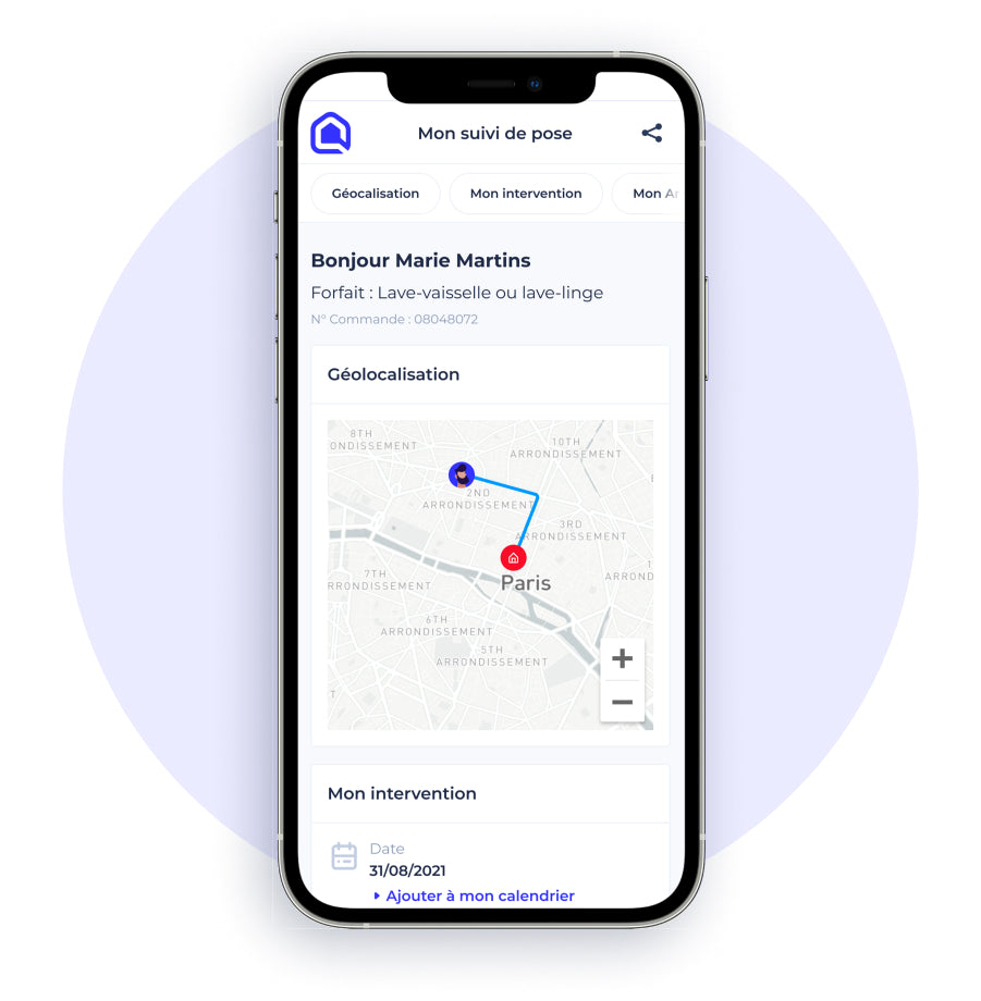 Vérifiez que tout est prêt pour votre Pose ! Le Jour J, notre Artisan va partager sa localisation avec vous ; vous verrez en temps réel sa position et pourrez l’accueillir.